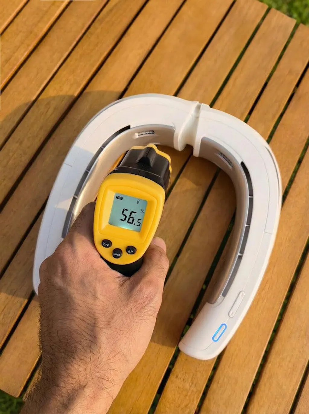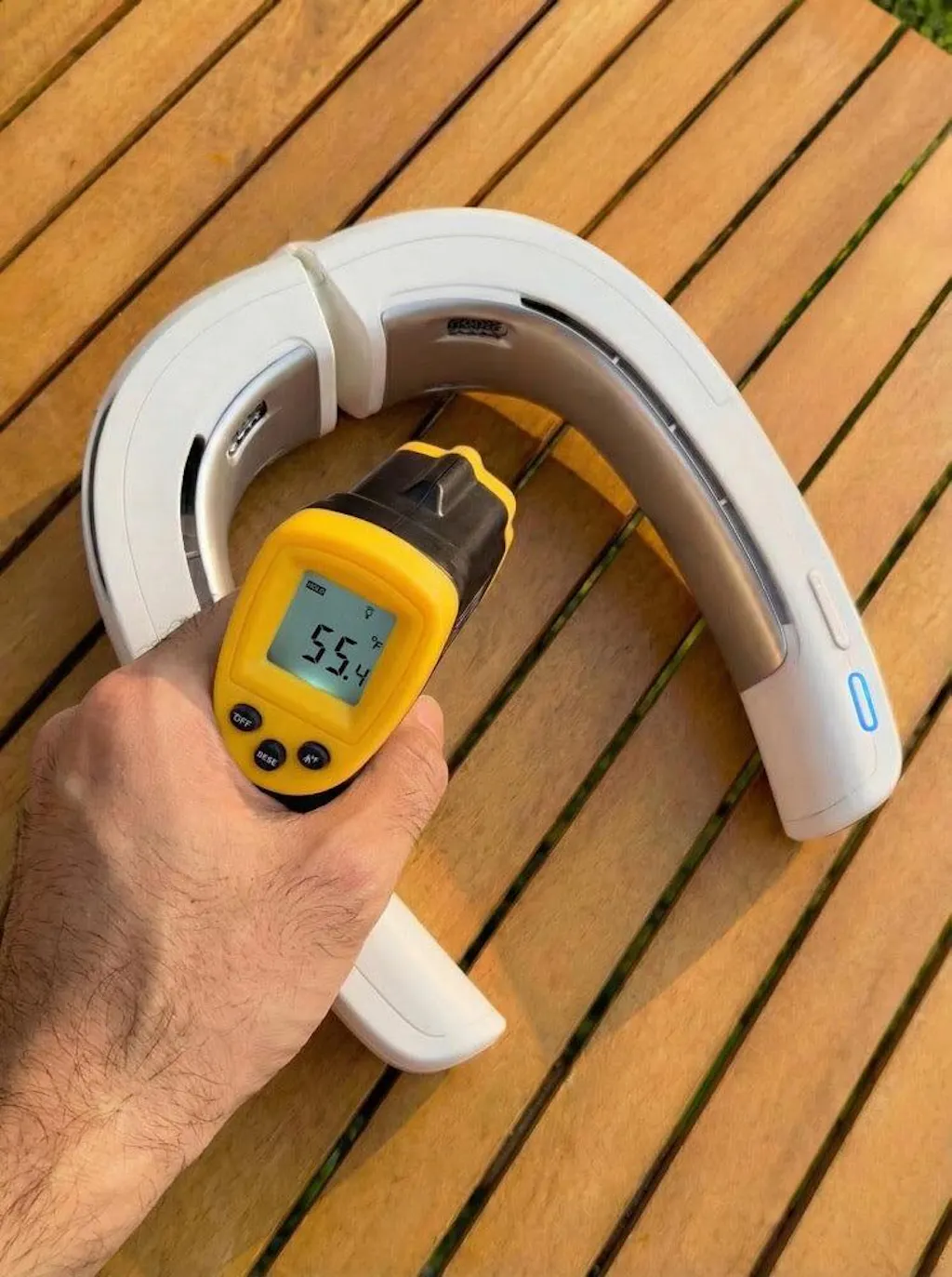 I purchased this based soley on You Tube Reviews. I thought the fan was good - then I switched in the Heating/ Cooling Element - WOW!!! It's just like a Temperature Controlled Cooler and Heater for your neck! It actually makes a Huge Difference. A Solid 5/5. You must Buy One!